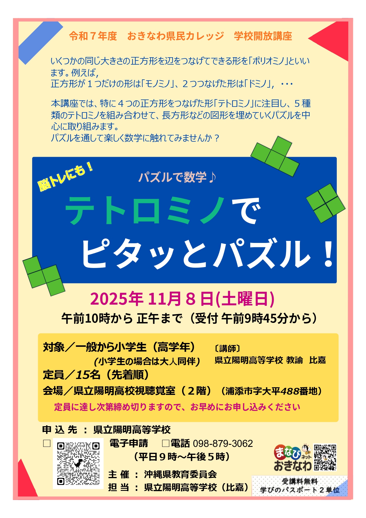 令和7年度 おきなわ県民カレッジ 学校開放講座パズルで数学♪テトロミノでピタッとパズル!〔講師〕県⽴陽明⾼等学校 教諭 ⽐嘉 脳トレにも! |