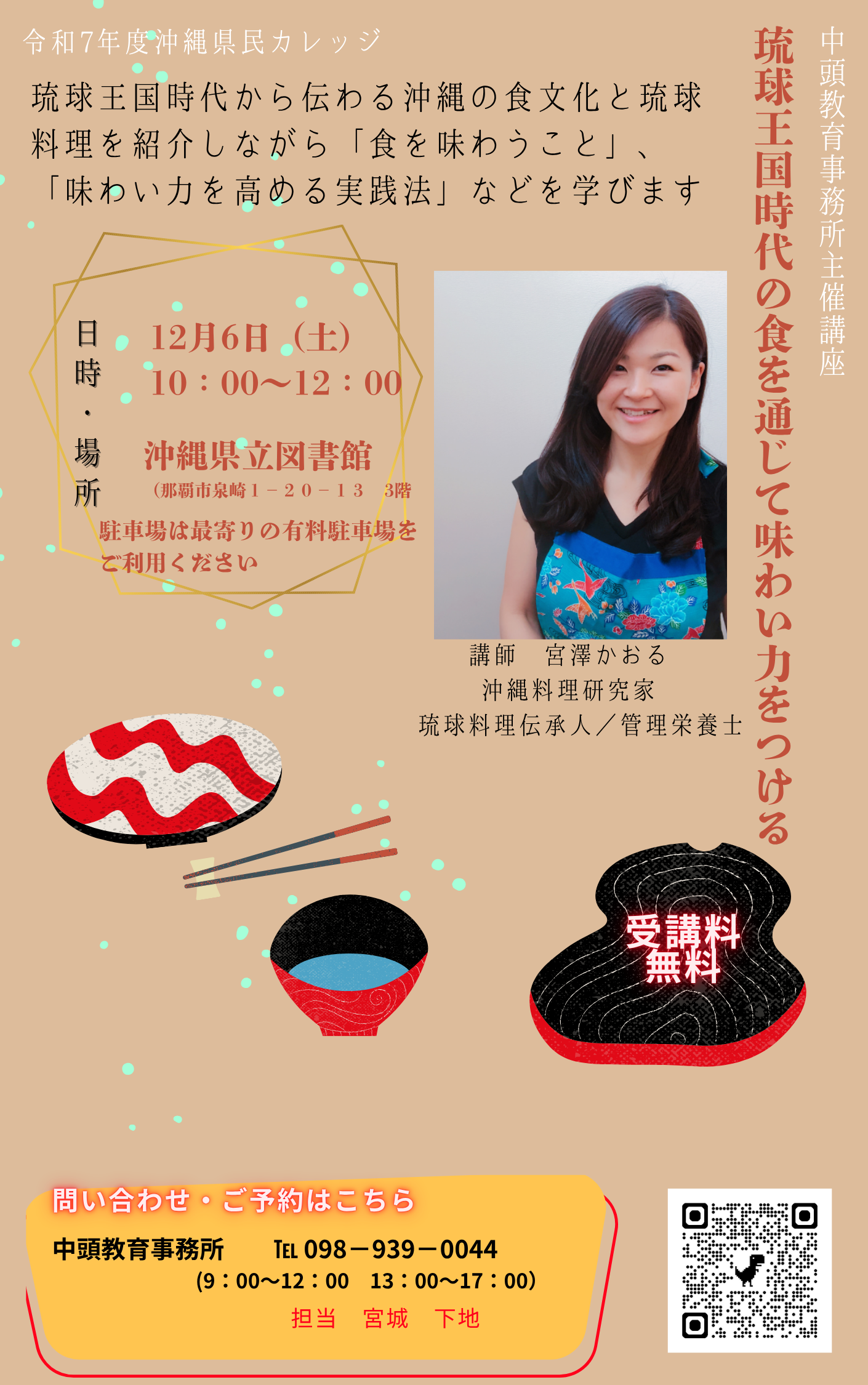 琉球王国時代から伝わる沖縄の食文化と琉球料理を紹介しながら、「食を味わうこと」、「味わい力を高める実践法」などを学びます。 講師:宮澤かおる(沖縄料理研究家・琉球料理伝承人) |