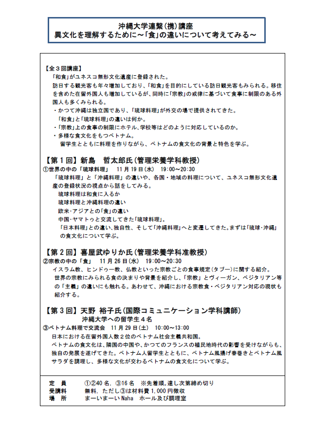 各回ごとのお申込みになります。 第1回 世界の中の「琉球料理」11/19→https://lgpos.task-asp.net/cu/472018/ea/residents/procedures/apply/be8aad87-6d25-49e9-9648-6ede67ada9e0/start 第2回 宗教の中の「食」11/26→https://lgpos.task-asp.net/cu/472018/ea/residents/procedures/apply/998b1d1d-2d0b-454e-9d9e-2fc4e83a65e8/start 第3回 ベトナム料理を囲んで交流会11/29→https://lgpos.task-asp.net/cu/472018/ea/residents/procedures/apply/26d81470-dd78-4acb-8b04-0750ecee6970/start |