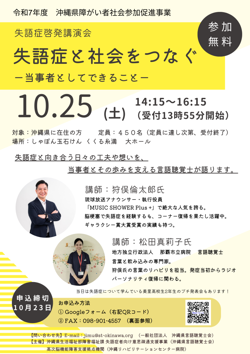 テーマ:「失語症と社会をつなぐ 〜当事者としてできること〜」 脳梗塞で失語症を経験された 琉球放送アナウンサー 狩俣倫太郎 氏 と、 当事者の日々の工夫や思い、そしてそれを支える専門家の視点から、 |