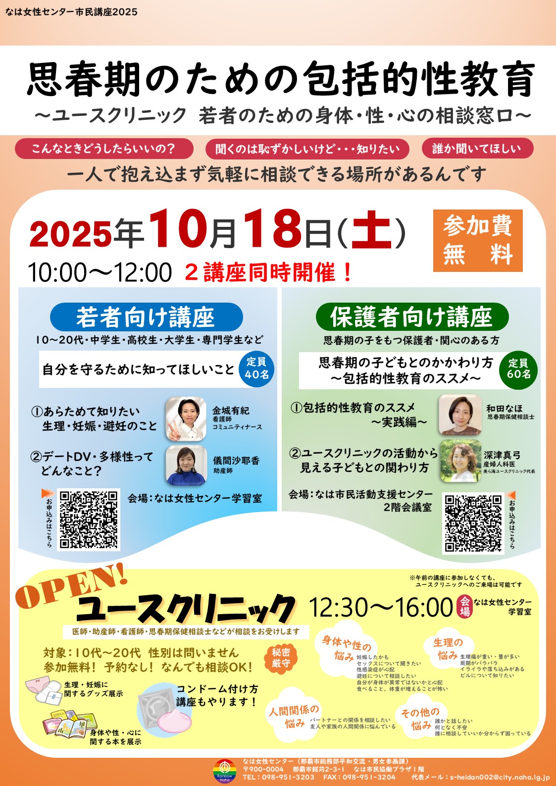 なは女性センター市民講座2025 ◆日時:10月18日(土)10時ー12時 ※ユースクリニックオープン(12時半ー16時) |