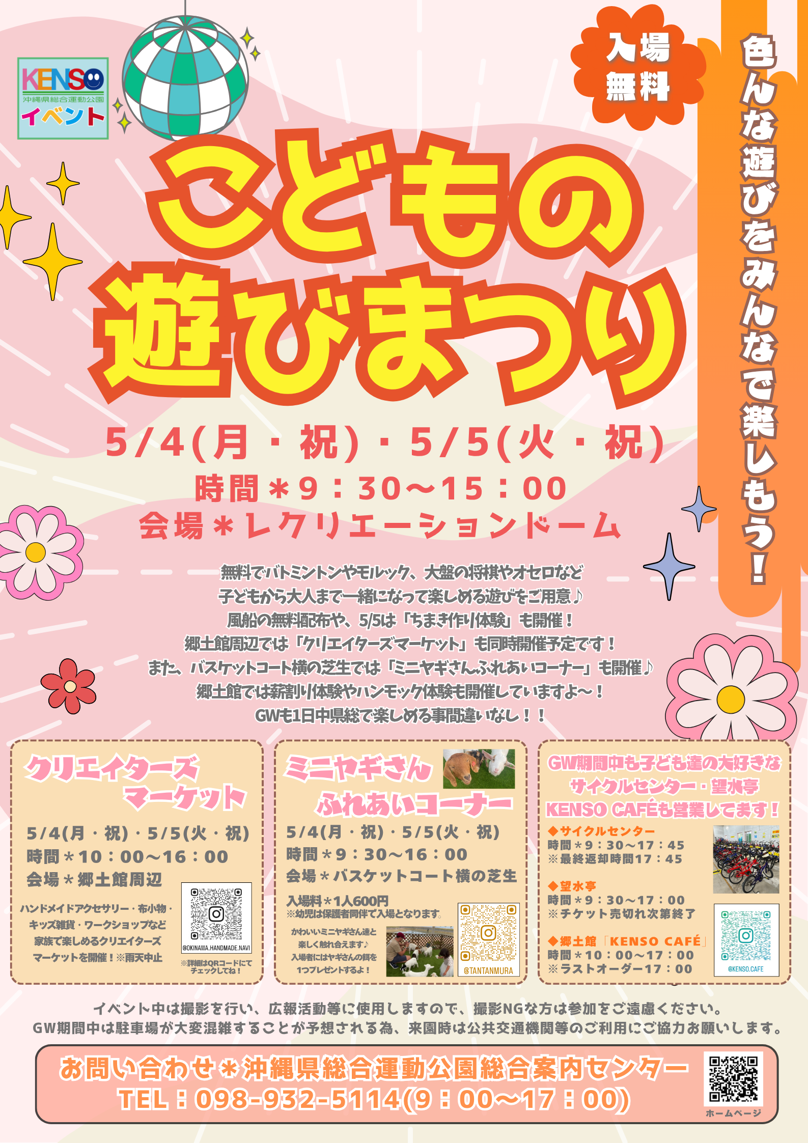GWも県総で家族と思い切り遊べるイベントとして開催! 今回はレクリエーションドームにて「こどもの遊びまつり」を行いますので、 雨天時も県総で遊べますよ~♪ 無料でバトミントンやモルックなど数種類の遊びが行える他に、 無料の風船配布や、5/5には「無料ちまき作り体験」なども行います! また、郷土館周辺では、ハンドメイドアクセサリーやキッズ雑貨、 ワークショップなどが楽しめる「クリエイターズマーケット」と、 バスケットコート横では、ミニヤギさんにエサをあげたり、触れ合ったりできる 「ミニヤギさんふれあいコーナー」も同時開催予定となっています! 1日中家族で楽しめる内容となってますので、GWはぜひ県総に遊びに来てください! |
