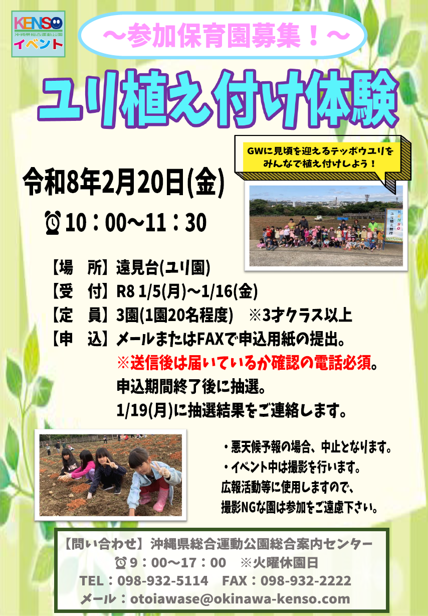 沖縄県総合運動公園のユリ園では、毎年4月下旬からゴールデンウィーク頃に かけて約5万輪のユリが咲き多くのお客様に喜んで頂いています☆★ ユリの開花を楽しんで頂くために園児たちを募集してユリ植付体験を開催致します!