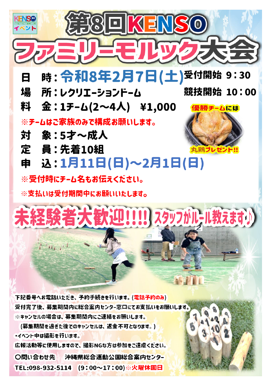 初心者でもできる簡単なルールで行いますので、 興味がある方はぜひ家族で参加してみてください♪ 申込は1/12(日)から開始となります! 優勝チームには景品で丸鶏をプレゼント! 誰でも優勝できるチャンスがある大会ですので、 ぜひご家族での参加をお待ちしています! イベント中は撮影を行います。