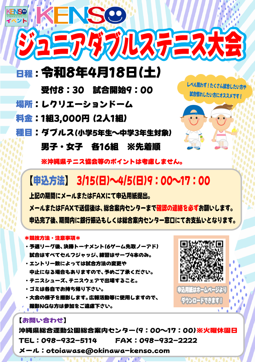 小学5年生~中学3年生の男女を対象にダブルステニス大会を開催します。 学年、レベルを考慮せずに行う大会なので、試合経験を積みたい方はぜひ!! 受付期間 令和8年3/15(日)~4/5(土) 9:00~17:00 ●競技方法● 予選リーグ後、決勝トーナメント(6ゲーム先取ノーアド) 試合はすべてセルフジャッジです。練習はサーブ4本のみ。 その他、詳細はポスターでご確認下さい! ※大会の様子を撮影します。広報活動等に使用しますので 撮影NGの方は参加をご遠慮ください。 |