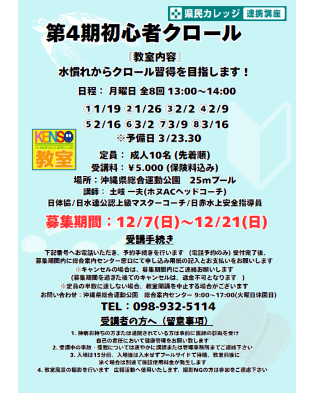★受講手続き 12月7日(日)~12月21日(日) 9:00~17:00 下記電話にて予約受付を行います。 募集期間内に、総合案内センター窓口で申込用紙の記入とお支払いをお願いします。 ※キャンセルする場合は、募集期間内にご連絡下さい。過ぎた後では、返金不可となります。