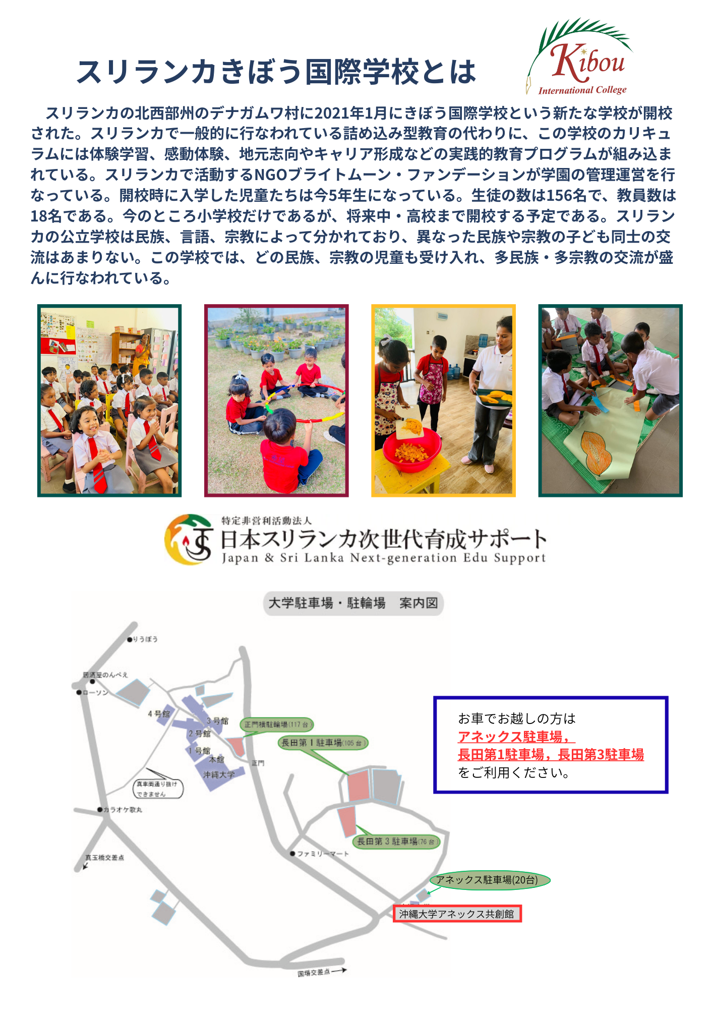 2025年3月、国際協力機構JICA草の根支援を受け、『スリランカきぼう国際学校』において『特別活動』いわゆる『特活』を導入することになりました。クラブ活動、朝礼・文化祭などはスリランカの学校にはありません。日本では当たり前に思っているこうした知識教育以外の活動(=特活)は体験学習と学生参加型授業を通して、子どもたちの自治能力、社会性や協調性を伸ばすことを目的にしています。自国と他国の比較をしながら、より良いものを追求してみる。今回の沖縄大学土曜講座はそこにスポットを当ててみました。