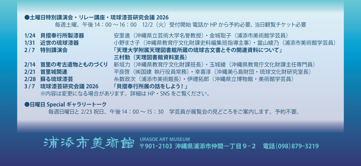 浦添市美術館開館35周年特別展 「超リアル!琉球王国の華・漆芸 貝摺奉行所展」【令和8年1月23日(金) ~ 3月8日(日)】の関連イベントとして、毎週土曜日午後2時より、「土曜日特別講演会・リレー講座・琉球漆芸研究会議2026」を開催します。1月24日(土)には、沖縄県立芸術大学名誉教授の安里進先生による「小国・琉球の漆器外交ー貝摺奉行所と民間工房」、浦添市美術館学芸員の金城聡子による「貝摺奉行所製漆器」などの講演会が開催されます。予約制ですので、美術館ホームページやSNSをご確認ください。 |