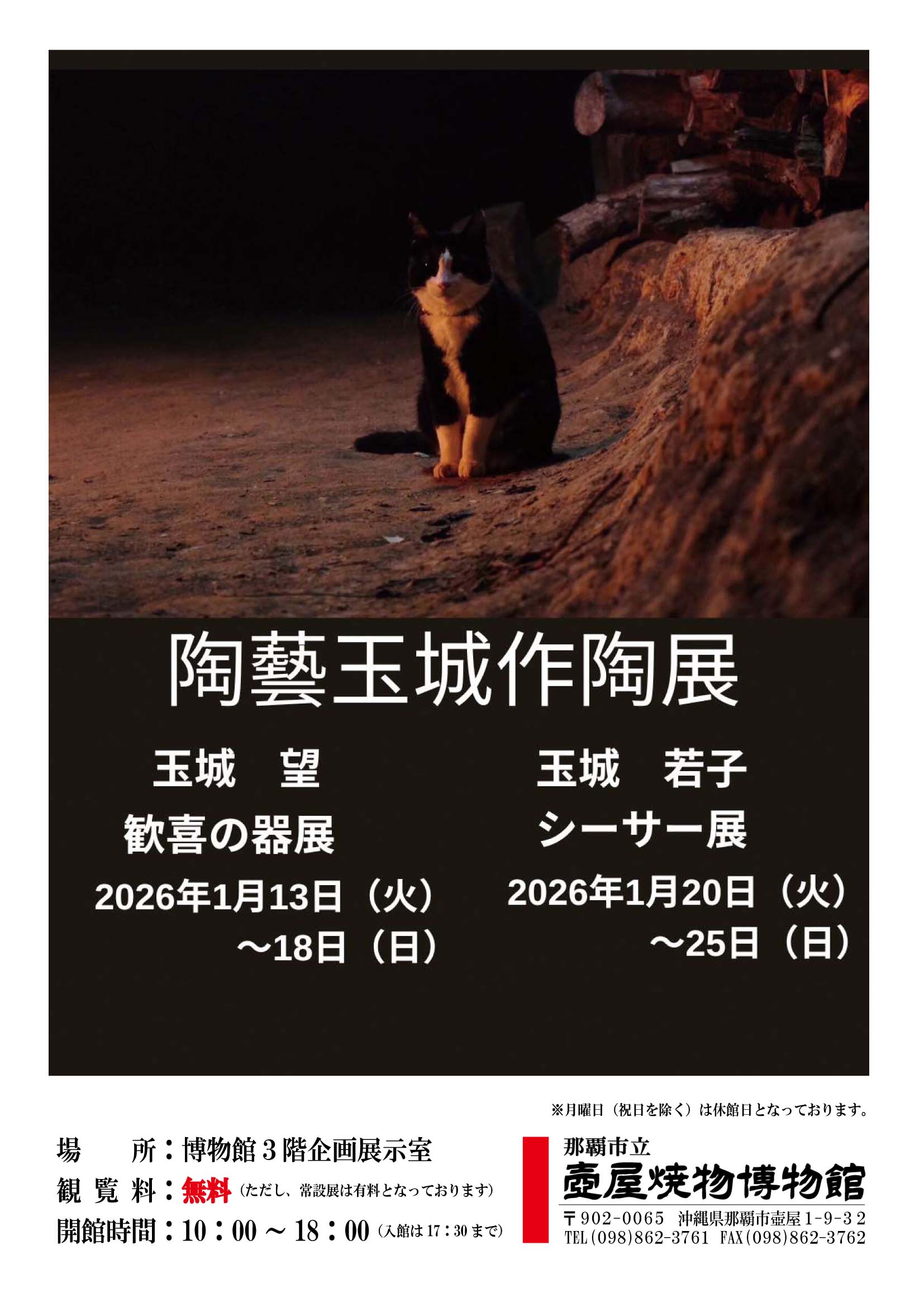陶藝玉城による展示会。「玉城望展 1/13(火)~1/18(日)沖縄の形、風土に根差した暮らしの器を中心に展示します。」「玉城若子展 1/20(火)~1/25(日)『力強さの中に愛らしさ』をテーマに土と向き合い生まれたシーサーに愛を込めてお届けします。」 |