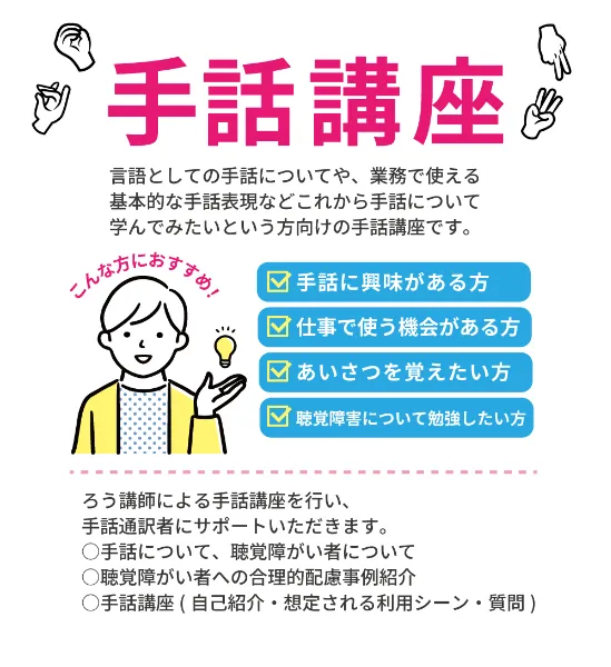 こんな方におすすめ! ✔ 手話に興味がある方 言語としての手話についてや、業務で使える基本的な手話表現などこれから手話について学んでみたいという方向けの手話講座です。