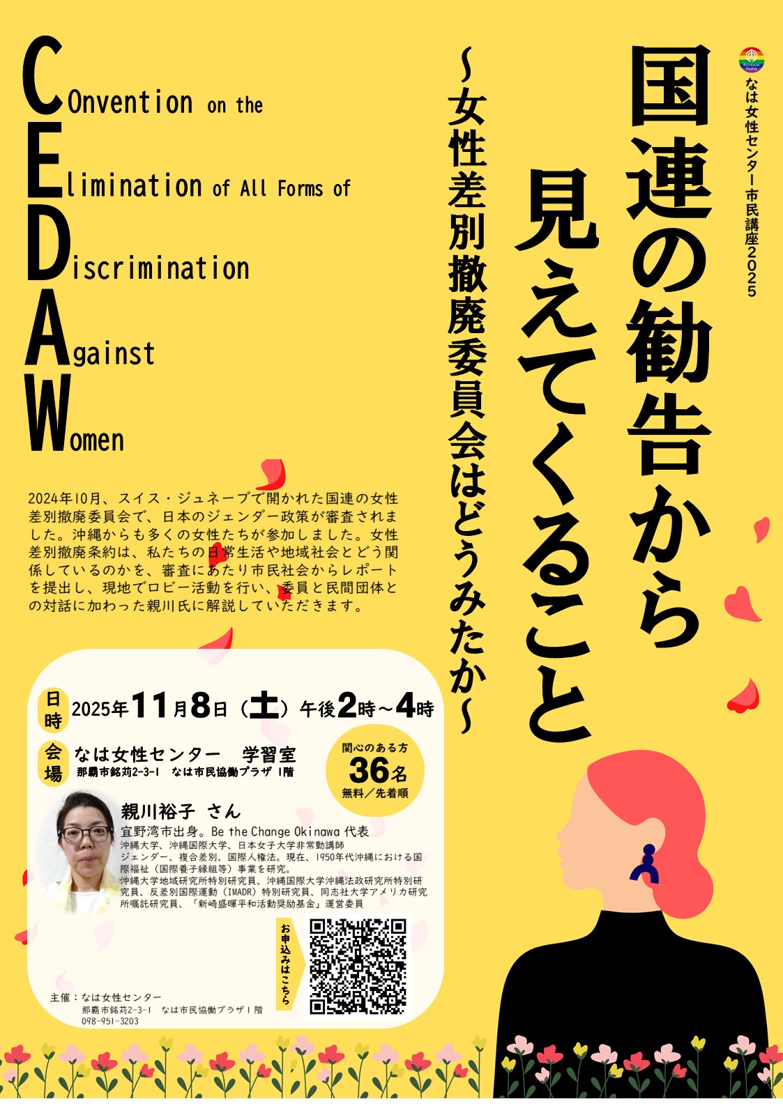 2024年10月、スイス・ジュネーブで開かれた国連の女性差別撤廃委員会で、日本のジェンダー政策が審査されました。沖縄からも多くの女性たちが参加しました。女性差別撤廃条約は、私たちの日常生活や地域社会とどう関係しているのかを、審査にあたり市民社会からレポートを提出し、現地でロビー活動を行い、委員と民間団体との対話に加わった親川氏に解説していただきます。