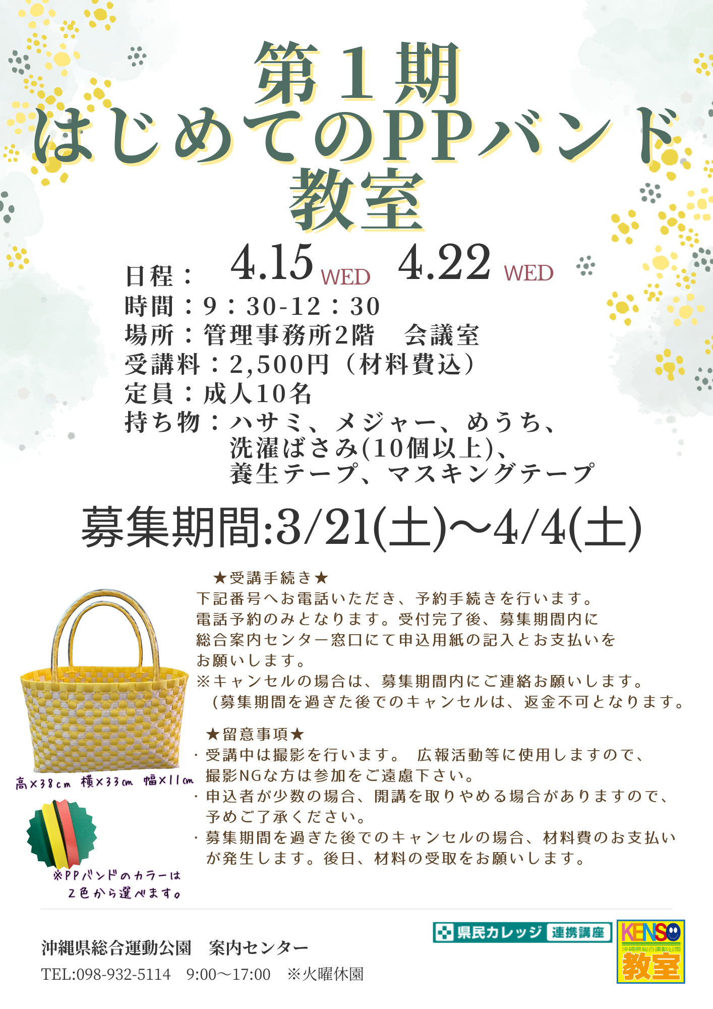 1)日程 毎週水曜日 計2回 9:30~12:30 ①4/15 ②4/22 2)場所 管理事務所 会議室 3)受講料 ¥2,500 【材料費込み】 4)定 員 成人 10名 【先着順】 5)受講手続き 下記番号へお電話いただき申込み後、受付期間内に 案内センターにてお支払いをお願い致します。 案内センター 098-932-5114(9時~17時)火曜休園 7)持ってくるもの ・ハサミ、メジャー、めうち、洗濯ばさみ(10個以上)、養生テープ、マスキングテープ ★受講者の方へ(留意事項) 1)撮影を行います。広報活動に使用しますので撮影NGの方は 参加をご遠慮ください。 2)募集期間を過ぎた後でのキャンセルの場合、材料費のお支払いが発生します。後日、材料の受取をお願いします。 |