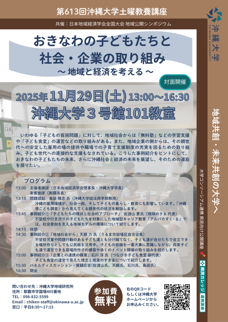 New! 第613回沖縄大学土曜教養講座「おきなわの子どもたちと社会・企業の取り組み~地域と経済を考える~」
